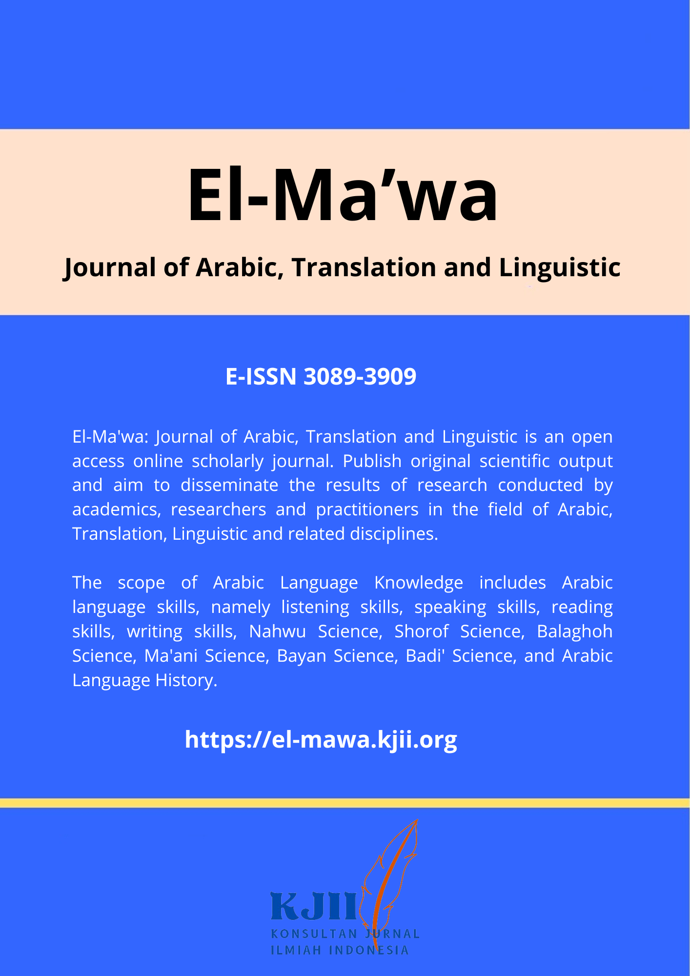 El-Ma'wa: Journal of Arabic, Translation and Linguistic is an open access online scholarly journal. Publish original scientific output and aim to disseminate the results of research conducted by academics, researchers and practitioners in the field of Arabic, Translation, Linguistic and related disciplines.